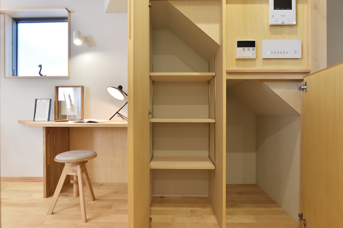 階段下のワークスペースは、それぞれの気配を感じながら自由に過ごせる空間です。
