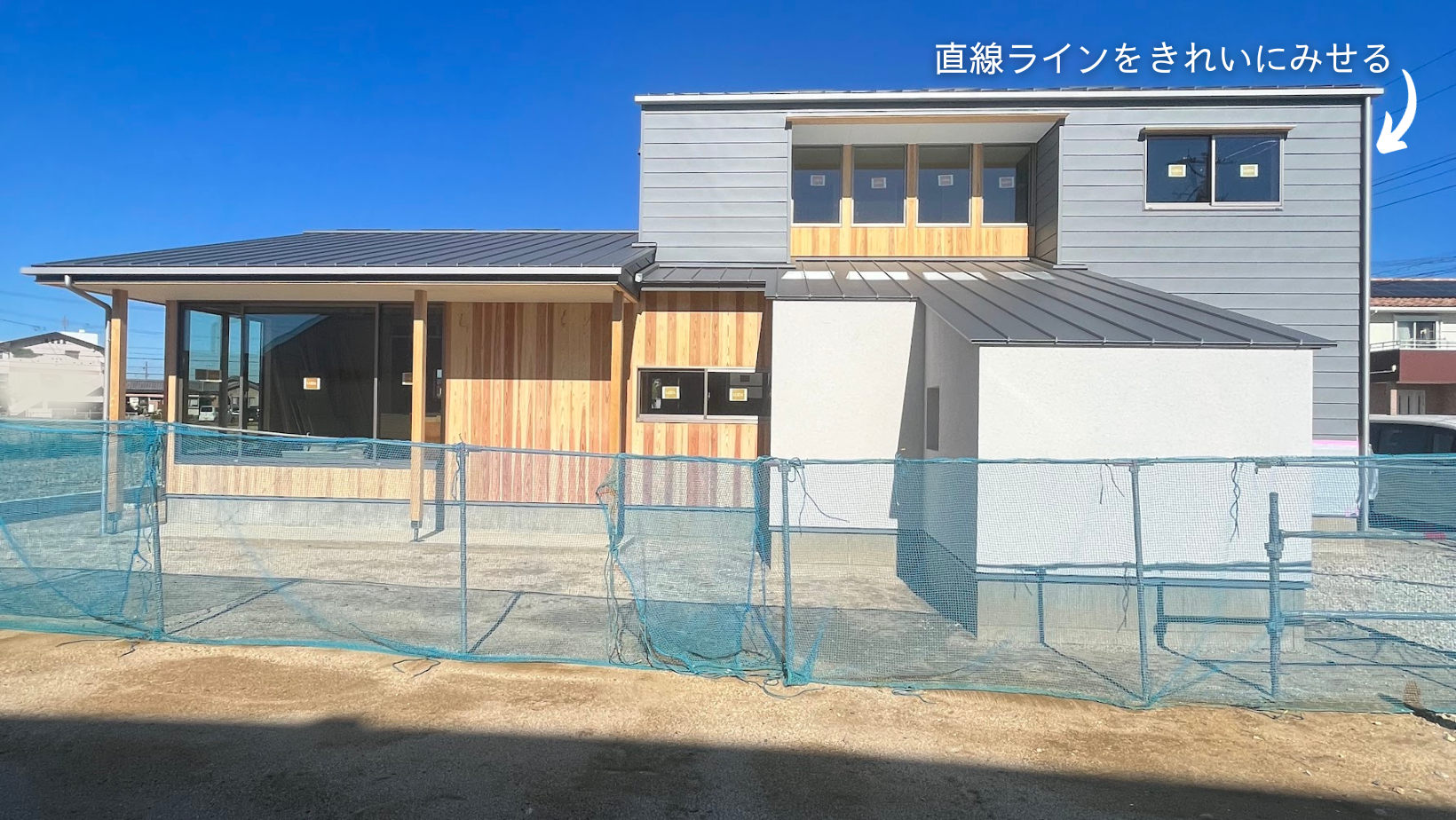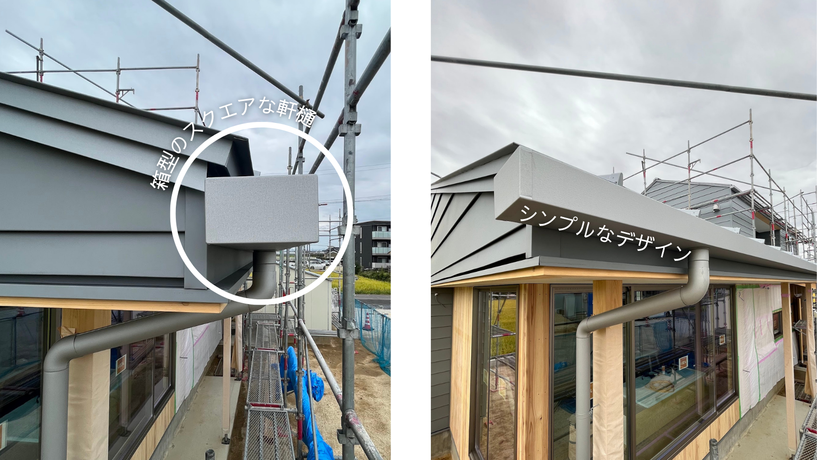 今回使用した軒樋は、箱型のシンプルなデザインで、素材は耐候性に優れたガルバリウム鋼板です。屋根の色味と合わせて一体感をだすことで、軒樋の存在感を消しています。樋というよりは屋根のフレームのように見えますよね。