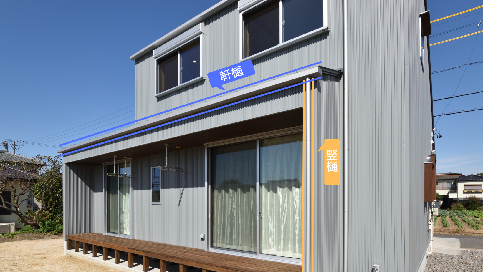 樋(軒樋・竪樋)は雨水を地面の排水口へ排出する役割があり、住まいの耐久性を高めるためにも必要なもの。どの住宅にも当たり前にある樋ですが、外観デザインの要素の一つになります。意匠的に重要な要素になるので、どのように表現するかを考えることが大切です。