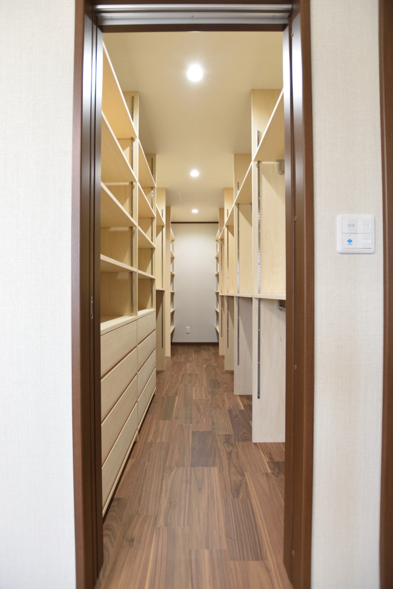 また、写真の事例は、廊下から必ずこのWICを通って奥の主寝室へ行く間取りになっています。WICをどの部屋の近くに造るかで誰が使うのかが決まりますが、多くは主寝室の隣、ご夫婦が使うために造られます。最近では、家の中心近くにWICを造って家族全員で使うファミリークローゼットも増えてきました。